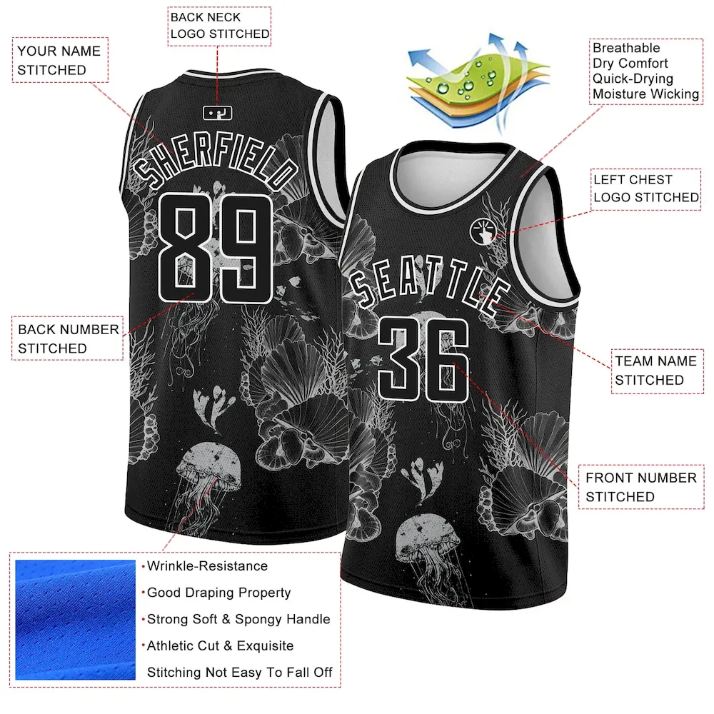 Custom Black White 3D Pattern Design Jellyfishes And Seashells Authentic Basketball Jersey
