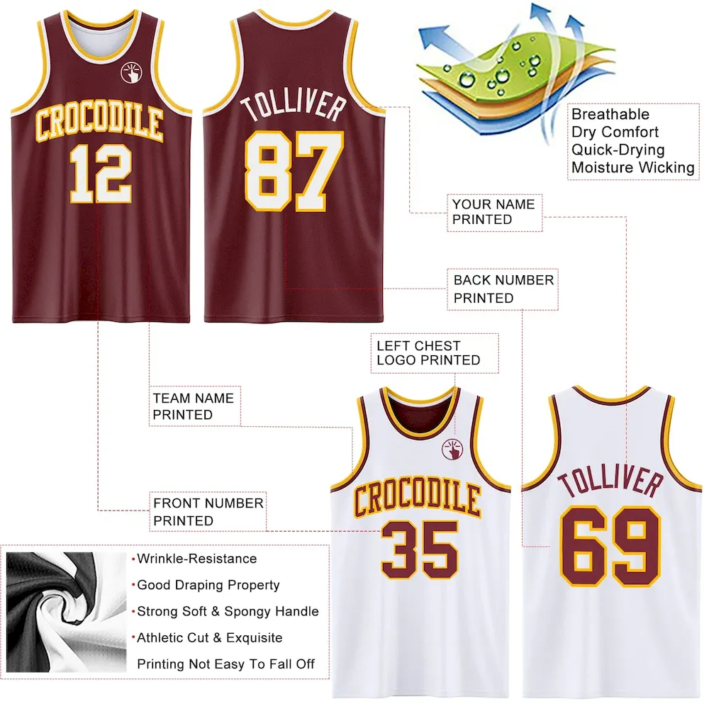 Custom Reversible Burgundy White-Gold Double Side Basketball Jersey
