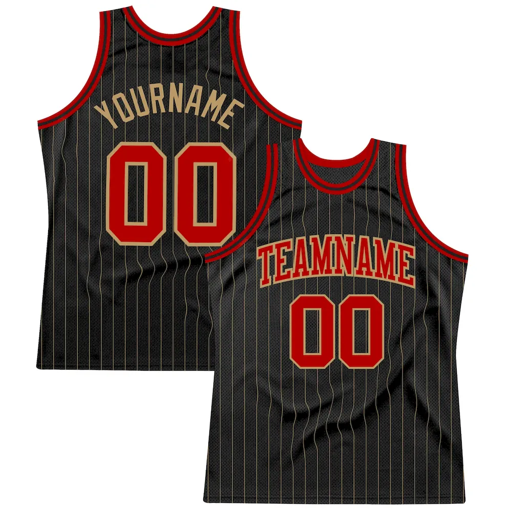Custom Black Old Gold Pinstripe Red-Old Gold Authentic Basketball Jersey