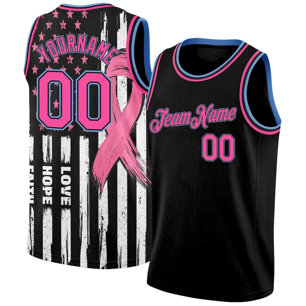 Custom Black Pink-Light Blue 3D American Flag Fashion With Pink Ribbon Breast Cancer Awareness Month Women Health Care Support Authentic Basketball Jersey