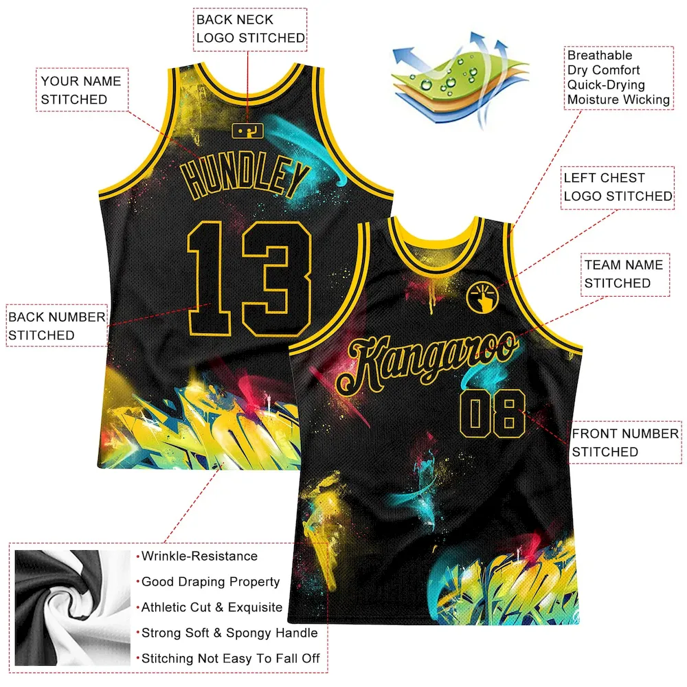 Custom Graffiti Pattern Black-Gold 3D Authentic Basketball Jersey