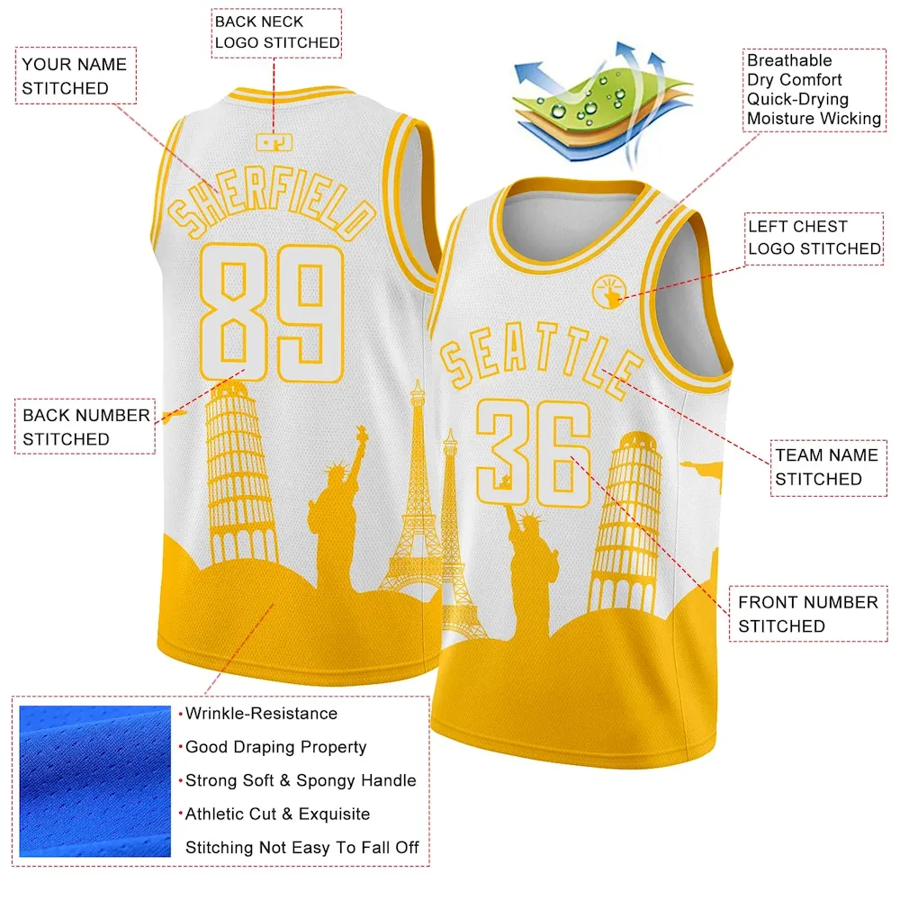 Custom White Gold Holiday Travel Monuments Silhouette Authentic City Edition Basketball Jersey
