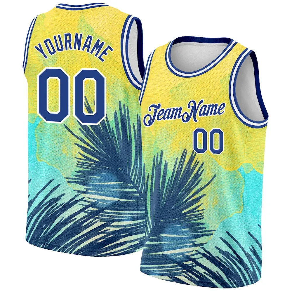 Custom Yellow Royal-White 3D Pattern Tropical Hawaii Leaves Authentic Basketball Jersey